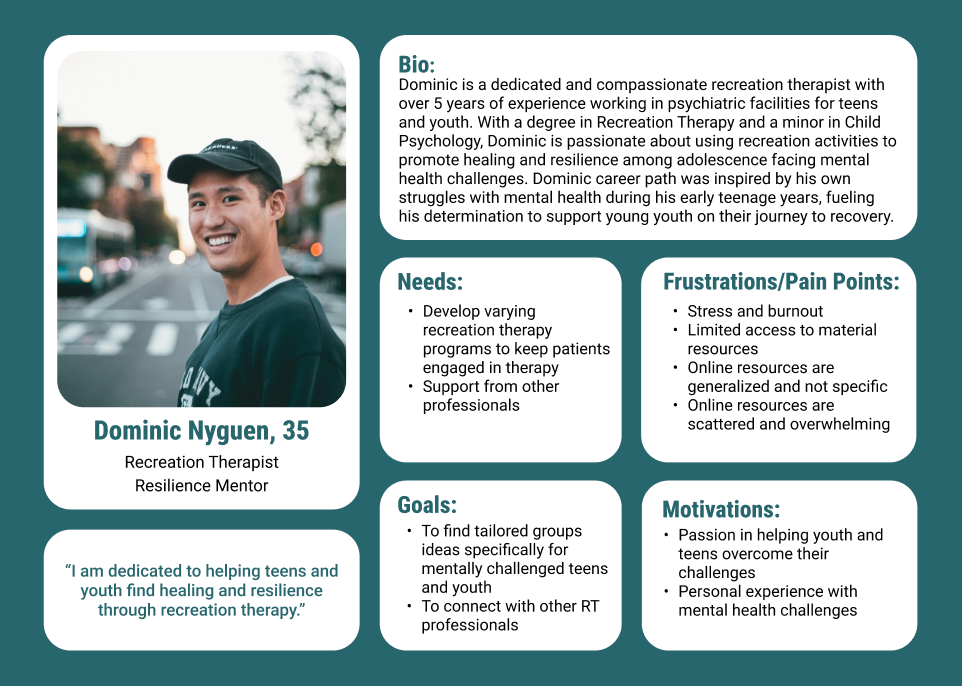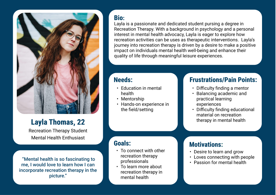 After defining the problem, I created user personas. Layla a recreation therapy student who who struggles to find mentorship and mental health-focused resources. Dominic an experienced therapist who faces burnout and lacks tailored resources to support his work with teens in psychiatric settings.